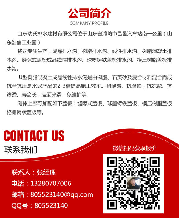 歡迎光臨山東瑞氏排水建材有限公司網站!主營:線性排水溝、樹脂排水溝、樹脂混凝土排水溝...熱線:132-8070-7006